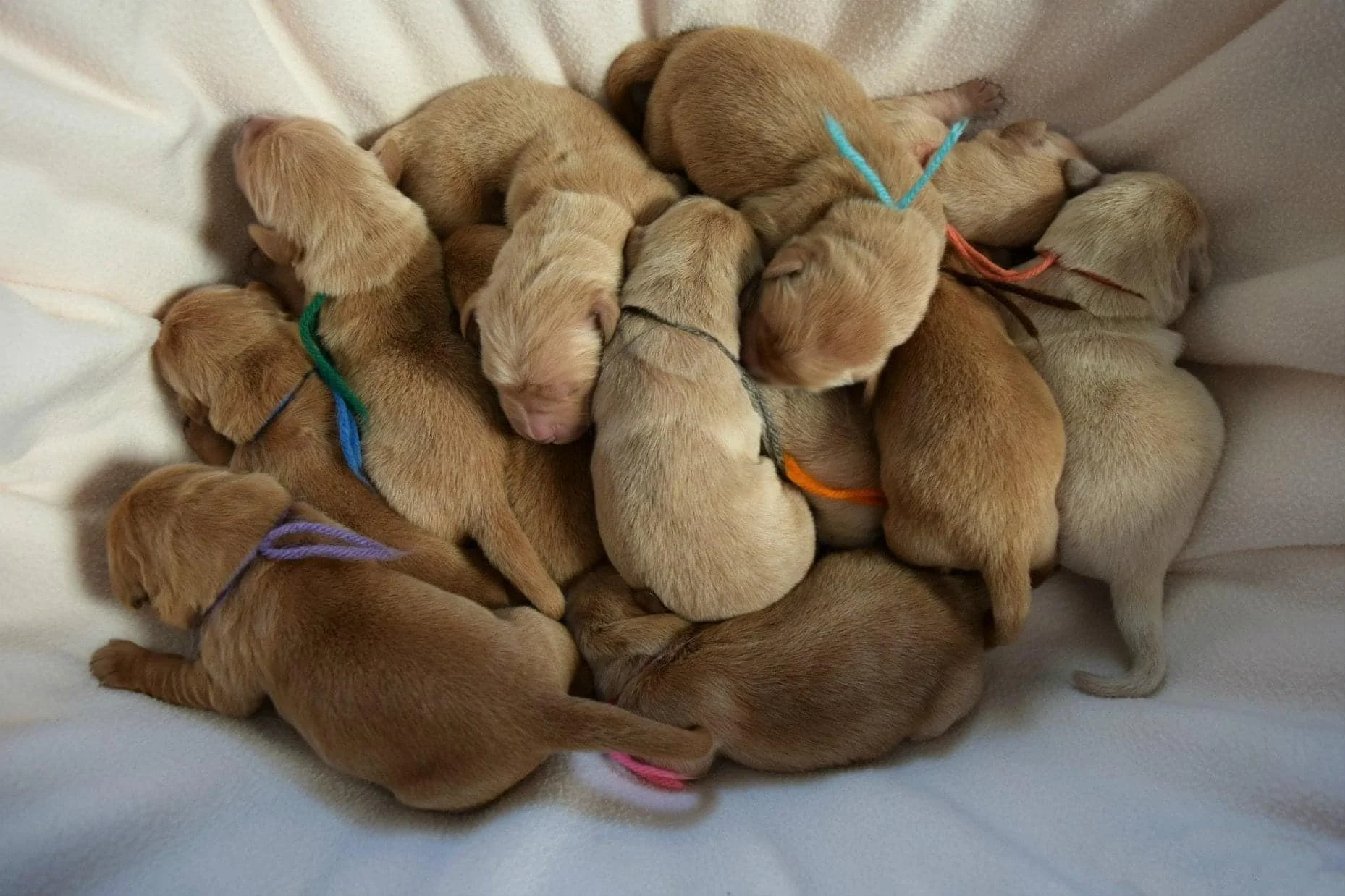 Puppies are weighed twice daily to monitor growth and ensure proper nursing.